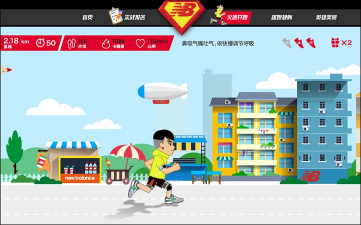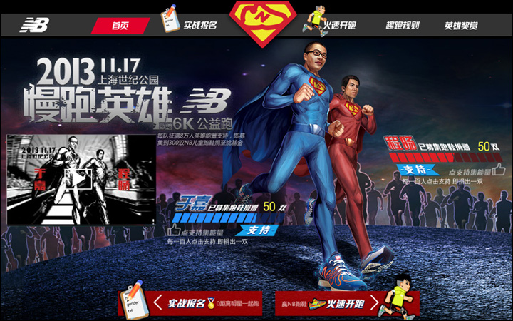 作為其互動(dòng)營銷代理商的Leadinfo(立特整合營銷傳播機(jī)構(gòu))便以英雄扮演的趣味方式為New Balance創(chuàng)意了一款在線趣跑游戲http://newbalance.renren.com,用戶只需用人人網(wǎng)賬號登錄,即可選擇卡通角色邊跑邊體驗(yàn)身為英雄的快感。